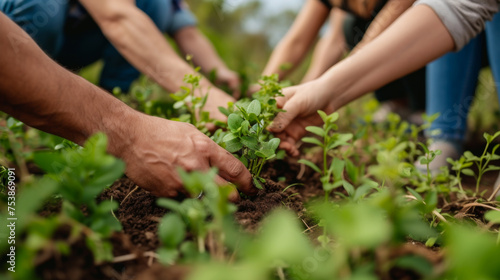 Close-up of a group of people planting small plants in a flowerbed. Team hands holding sprouts for farming in green business. Concept of gardening, ecology.
