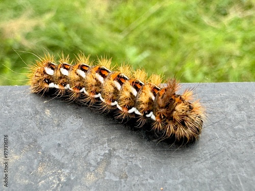 Close-up of a hairy caterpillar with vibrant colors and distinct patterns resting on a dark surface. Taken on August 15, 2018, Ardèche, France