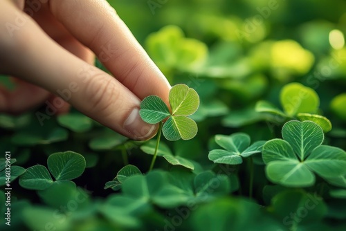 Close-up of a hand gently touching a four-leaf clover among green clover plants in a natural outdoor setting, symbolizing luck and calmness