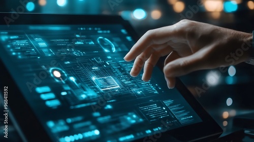 Close-up of a hand interacting with a digital interface with glowing blue lines and data points.