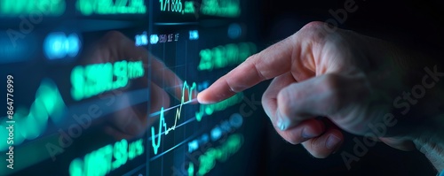 Close-up of a hand pointing at a digital financial chart with data on a screen, signifying stock market analysis and investing trends.