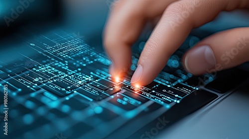 hand, key, technology, close, press, futuristic, keyboard, illuminated, blue, light, symbolize, electronic, input, science, information, hardware, signal, advance, database, artificial, datum, touch screen, computer, system, application, innovation, contraption, design, program, interaction, modern, transfer, software, aesthetic, worked, virtual, interface, image, circuit, user