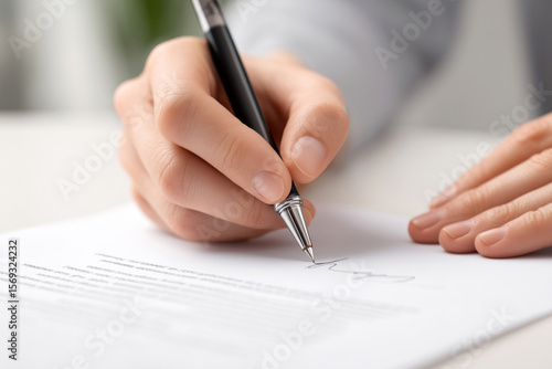 Close-up of a hand signing a formal document with a pen, symbolizing agreement, authorization, or official approval in a professional or legal setting