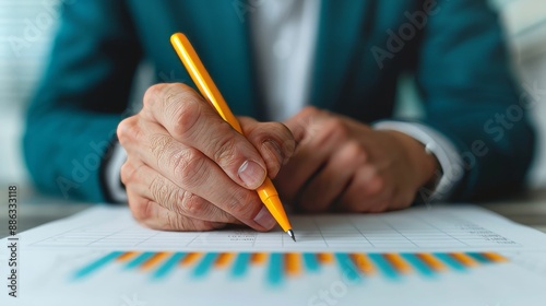 Close-up of a hand writing on a graph with a yellow pencil. The hand is wearing a blue blazer.
