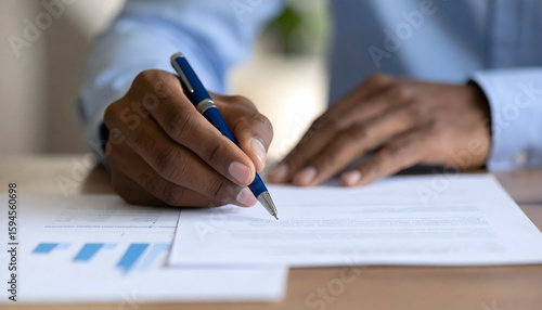 writing, hand, pen, document, paper, business, office, work, agreements, signing, signature, paperwork, closeup, detail, professional, employee, person, man, black, skin, blue, colours, chart, graph, datum, information, analysis, planning, strategy, report, meeting, contract, legal, corporate, finance, accounting, review, study, project, plan, decision, process, concept, idea, communication, collaboration, sharpened, modern, contemporary
