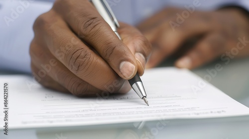 Close-up of a hand writing with a pen on a document, emphasizing agreement, signing, and business concept.
