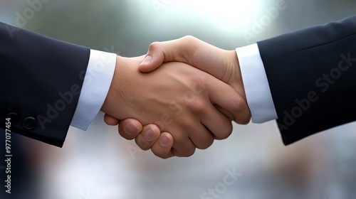 Close-up of a handshake between two business professionals in formal suits, symbolizing agreement and partnership.