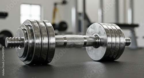 Close-up of a heavy dumbbell resting on the floor in a modern gym setting