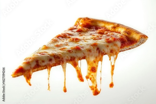 Close-up of a hot slice of cheese pizza with melted, stretchy cheese dripping down against a white background
