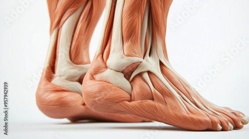 Close-up of a human anatomical model showcasing the intricate structure of the ankle and foot, highlighting the muscles and bones.