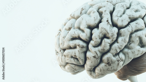 Close-up of a human brain model displaying visible age-related changes, including wrinkles and discoloration, on a white background with ample copy space. Focus on the natural aging