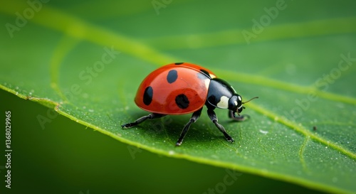 Close-up of a ladybug crawling on a green leaf in a vibrant natural setting