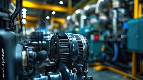 Close-up of a large industrial motor. This photo is ideal for projects about industry, engineering, and manufacturing.