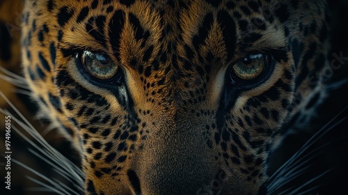 Close-up of a Leopard's Face with Intricate Fur Pattern and Focused Eyes