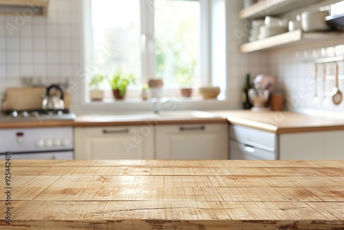 Close-up of a light wooden table in a bright kitchen with blurred window and countertops in the background