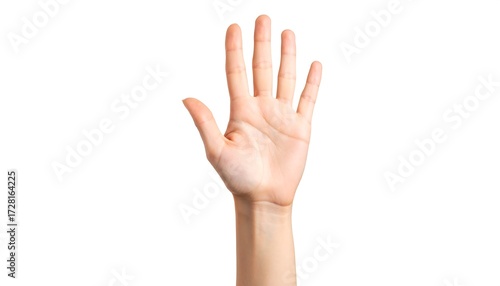 hand, finger, raised, 5, light, skin, arm, palm, up, human, body, gesture, isolated, white, background, tone, anatomy, showing, digit, forearm, cuticle, nail, flesh, pale, texture, smooth, natural, caucasian, body part, image, studio, still, life, closeup, detail, photo, realistic, simple, clean