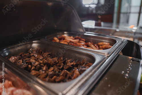 Close-up of a luxury hotel's buffet featuring sauteed mushrooms and assorted sausages in stainless steel chafing dishes. Sophisticated interior with ambient lighting.