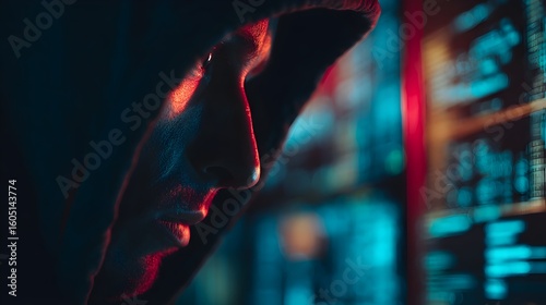 Close-up of a male figure with a hood, illuminated by vibrant blue and red lights, immersed in the world of technology.
