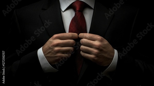 suit, attaching, red, adjusting, hand, formal, business, grooming, man, clothing, style, fashion, closeup, detail, dark, background, black, white, shirt, collar, sleeve, cuff, texture, fabric, professional, elegant, classic, sharp, clean, confidence, power, success, image, photo, minimal, simple, masculine, portrait