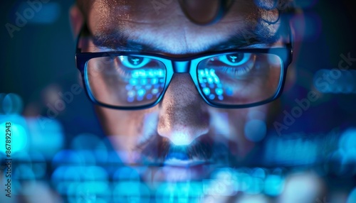 man, male, face, goggles, eyeglass, spectacle, eye, looking, screen, computer, laptop, technology, digital, closeup, closeup, portrait, focused, serious, concentrated, work, business, cyberspace, online, blue light, blue, dark, blur, abstract, background, futuristic, datum, code, programmer, hacker, night, workplace, office, home office, future, cyber, artificial intelligence, ai