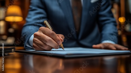 hand, pen, gold, document, signing, suit, man, closeup, business, contract, desk, paper, formal, agreements, legal, office, professional, signature, writing, luxury, detail, sharpened, elegant, classic, finance, table, wood, dark, light, shadow, blur, background, style, work