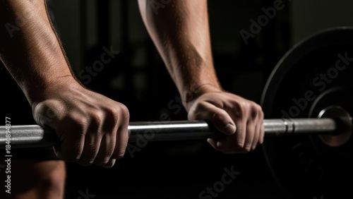 Close-up of a man's strong hands gripping a barbell in a dark gym.