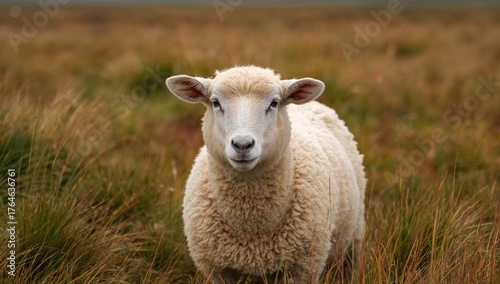 Close-up of a mature Cheviot lamb standing in a vibrant coastal meadow, facing the camera with room for text.