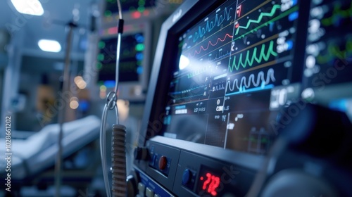 monitor, medicals, hospital, room, equipment, vital, signs, nubes, rate, blood, pressure, oxygen, saturation, temperature, screen, display, digital, reading, datum, health care, technology, electronic, wire, cable, blue, green, red, white, black, light, blurry, background, clinical, critical, care, treatment, patient, emergency, intensive, unit, icu