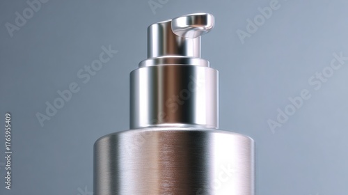 metallic, bottle, pump, dispenser, stainless, steel, shiny, finish, body, cylindrical, shape, pointed, flat, footed, silver, colours, attached, nozzle, curved, background, light, blue, making, racked, design, product, sleek, photo
