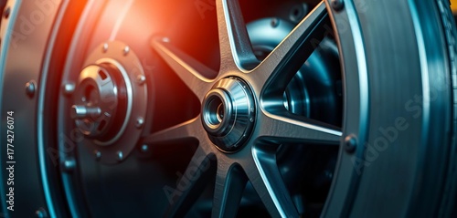 Close-up of a metallic wheel, intricate detail, industrial design, reflection, round