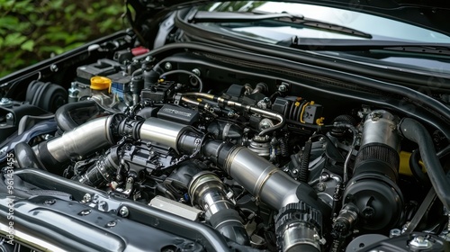 Closeup of a Modern Car Engine Bay with Turbocharger