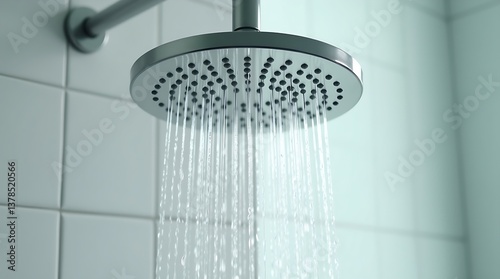 Close-up of a modern chrome circular showerhead with uniform water spray, mounted on a curved arm, set against a blurred neutral-tiled bathroom background.