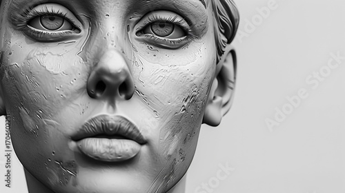 sculpture, woman, face, monochrome, clay, art, detail, texture, portrait, head, eye, open, material, artist, artwork, female, beauty, expression, fine, studio, design, contemporary, creative, elegance, style, modern, aesthetic, artistic, visual, representation, human, likeness, form, shape, structure, composition, element, facet, characteristic, attribute