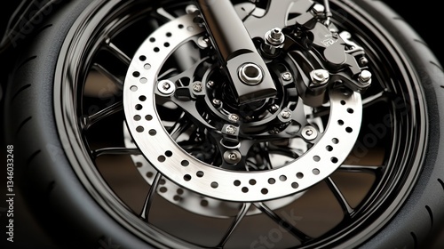 motorcycle, wheel, brake, disc, system, rotor, caliper, piston, metal, chrome, black, tire, rubber, speed, power, transport, machine, vehicle, engine, detail, closeup, technology, design, engineering, mechanic, performance, safety, riding, asphalt, road, motion, travel, adventure, freedom, style, luxury, elegance, precision, craftsmanship, industrial, equipment, part, component, structure, texture, surface, shine, gloss, dark