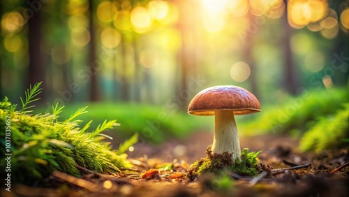 Close-up of a mushroom growing in the forest grass soil during summer with shallow depth of field