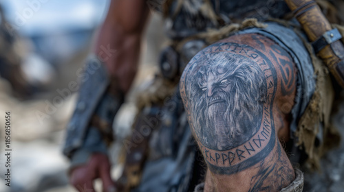 tattoo, man, thigh, illusion, scandinavian, viking, god, mythology, deity, nordic, warrior, mythical, ancient, rune, stone, texture, earthy, tribal, masculine, powerful, mystical, symbol, traditional, intricate, detailed, symbolic, body art, spiritual