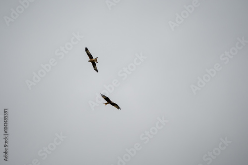 close-up of a pair of wild red kites (Milvus milvus) in flight