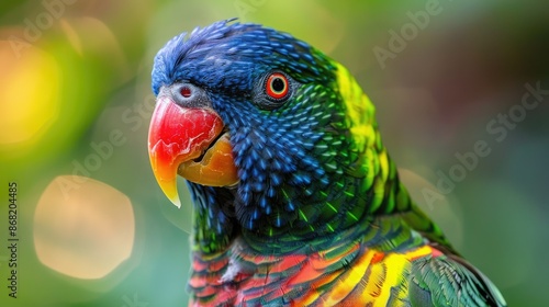 Close-up of a parrot's face, showcasing its bright beak and colorful plumage