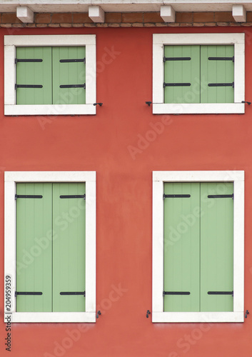 closeup of a particular facade of a building with green windows