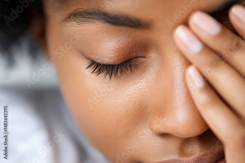 Close-up of a peaceful African woman's face with smooth skin, long lashes, and a calm expression resting with hand gently covering