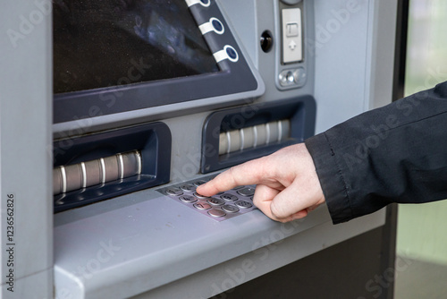 close-up of a person entering a pin code on an atm keypad, highlighting modern banking technology and financial transactions