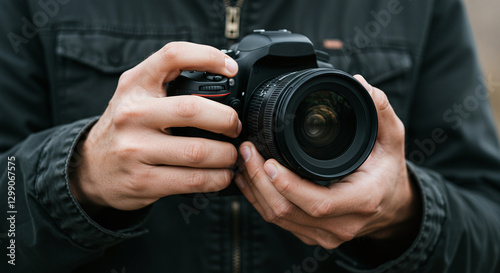 Close-up of a person holding a black DSLR camera with both hands, wearing a dark jacket.