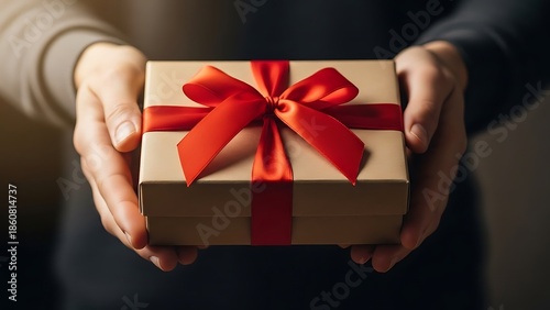 Close-up of a person holding a brown gift box tied with a luxurious red satin ribbon bow, offering a surprise.