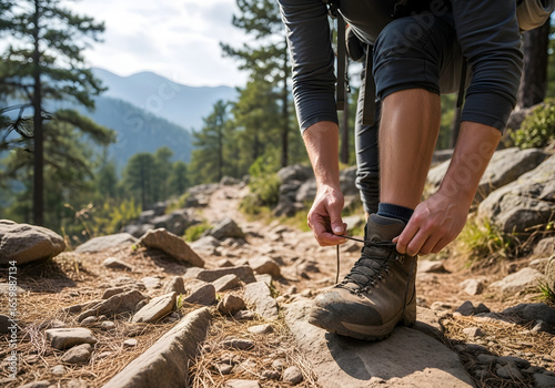 person, human, leg, hand, foot, shoe, boot, lace, attaching, knot, nature, trail, path, rock, stone, dirt, ground, forest, tree, pine, mountain, hill, landscape, scenery, adventure, explore, trek, hike, walk, journey, travel, active, leisure, hobby, sport, fitness, exercise, gear, equipment, footwear, natural, rugged, terrain, wilderness, environment, sun, light, day