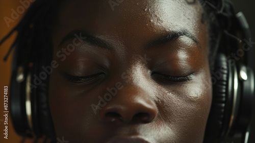 Close-up of a person wearing headphones, focusing on the headphones and their relaxed expression