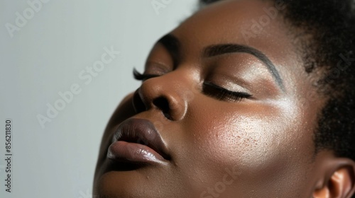 Close-up of a person with a serene expression showcasing a well-defined makeup look featuring bold eyeliner voluminous lashes and a glossy lip.
