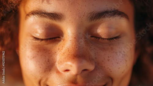 Close-up of a person’s face with closed eyes, a gentle smile indicating inner peace and healing