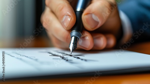 Close-up of a person's hand writing with a fountain pen on a paper, emphasizing the art and elegance of handwriting and communication.