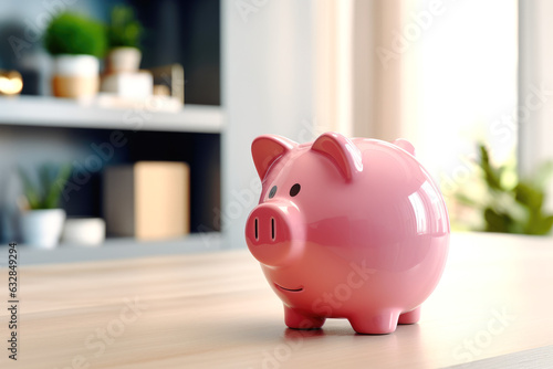 Close-up of a pink piggy bank on a table in an apartment. Accumulation and savings.
