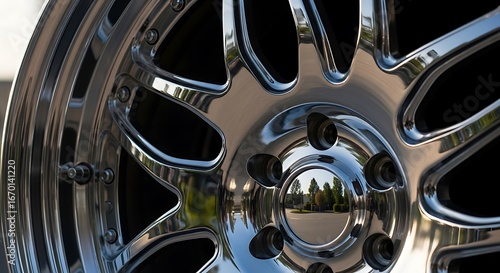 wheel, car, rim, tire, auto, vehicle, transportation, alloy, metal, spoke, chrome, polished, shiny, reflective, mirror, surface, detail, closeup, macro, design, pattern, modern, style, luxury, performance, custom, modification, automotive, industry, engineering